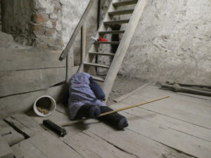 Mir zwei Fahrzeugen rückten die jugendlichen Einsatzkräfte an, um „Erna“ (eine Strohpuppe) aus ihrer misslichen Lage zu retten. Erna war beim Fegen des Kirchturms über einen kaputten Besen gestürzt und konnte nicht mehr laufen. So musste Erna die steile und sehr enge Steintreppe im Tragetuch heruntergetragen werden. Unten angekommen wurde sie auf eine Trage umgebettet und medizinisch weiter versorgt.