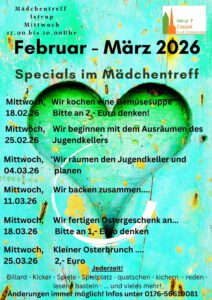 Mittwochs findet ein Offener Mädchentreff von 17.00 – 20.00Uhr